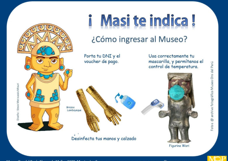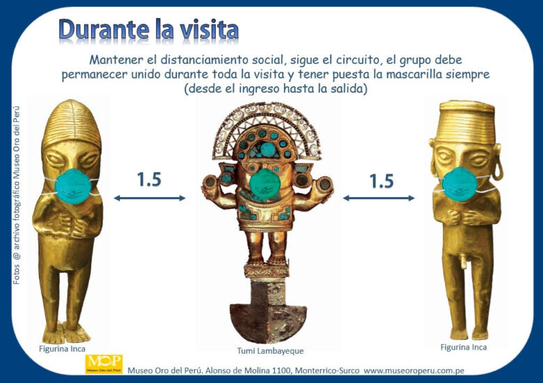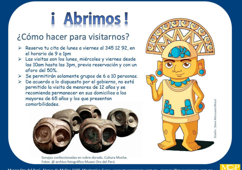 En las vitrinas del Museo Oro del Perú, se exhiben las más importantes manifestaciones del arte prehispánico, así como, avances tecnológicos desarrollados por los antiguos pobladores peruanos para la extracción (minería), procesamiento (metalurgia) y confección (orfebrería) de objetos de metal. También se pueden apreciar otros tipos de objetos como textiles, cerámicas, madera y lítico de diversas culturas como Moche, Chimú, Lambayeque, Frías, Vicus, entre otras. Ven a visitarnos y asómbrate con las maravillosas piezas que conformaron el ajuar funerario de importantes dignatarios entre las que podemos destacar, el Tumi (cuchillo ceremonial), máscaras funerarias, Keros y Aquillas (vasos ceremoniales, Unkus (vestidos), ornamentos, literas entre otros. Queremos resaltar que el Museo Oro del Peru cuenta con la colección más grande de Tumis y con una colección importante de piezas de estilo Frías